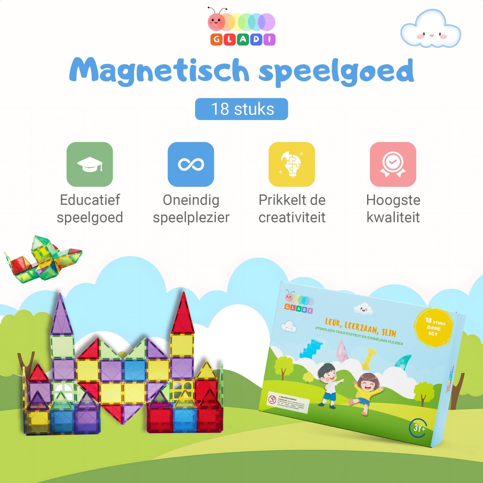 Gladi Tiles zijn veilige magnetische bouwstenen waarmee kinderen vanaf 3 jaar eindeloos kunnen bouwen, spelen én leren.